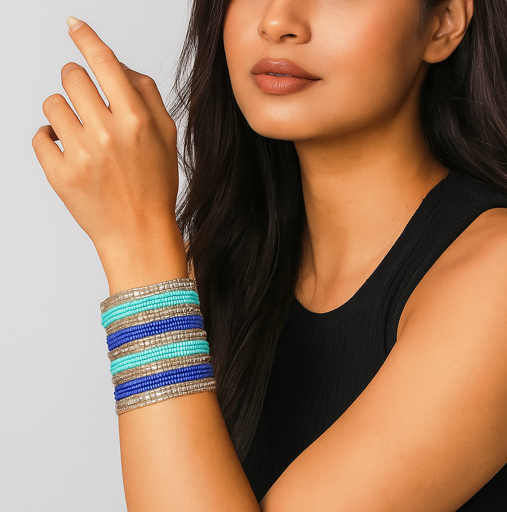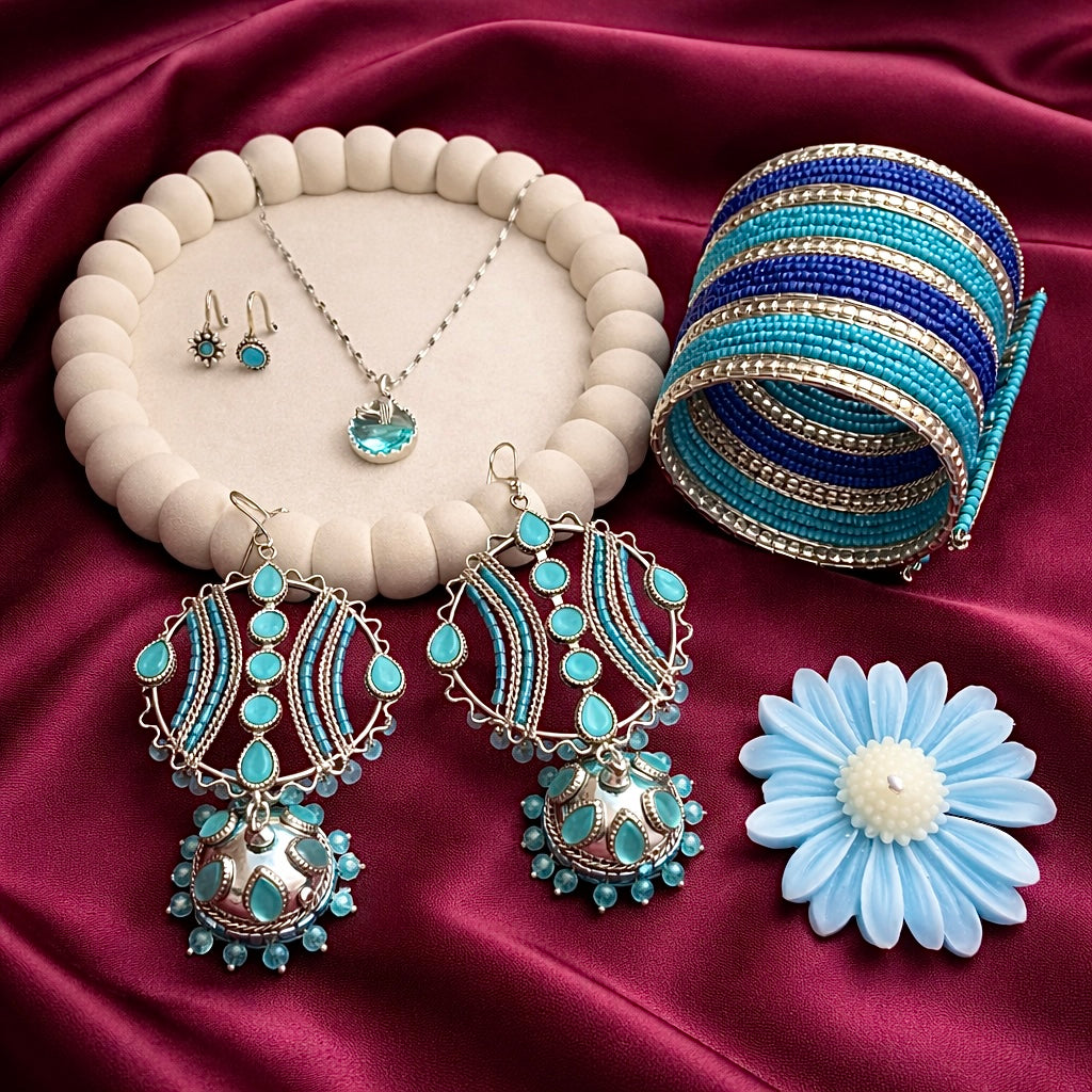 This combo contains our viral Maula mere maula earrings, blue hiru handcuff, blue mermaid pendant chain, blue daisy candle and 2 blue nose rings (any design)