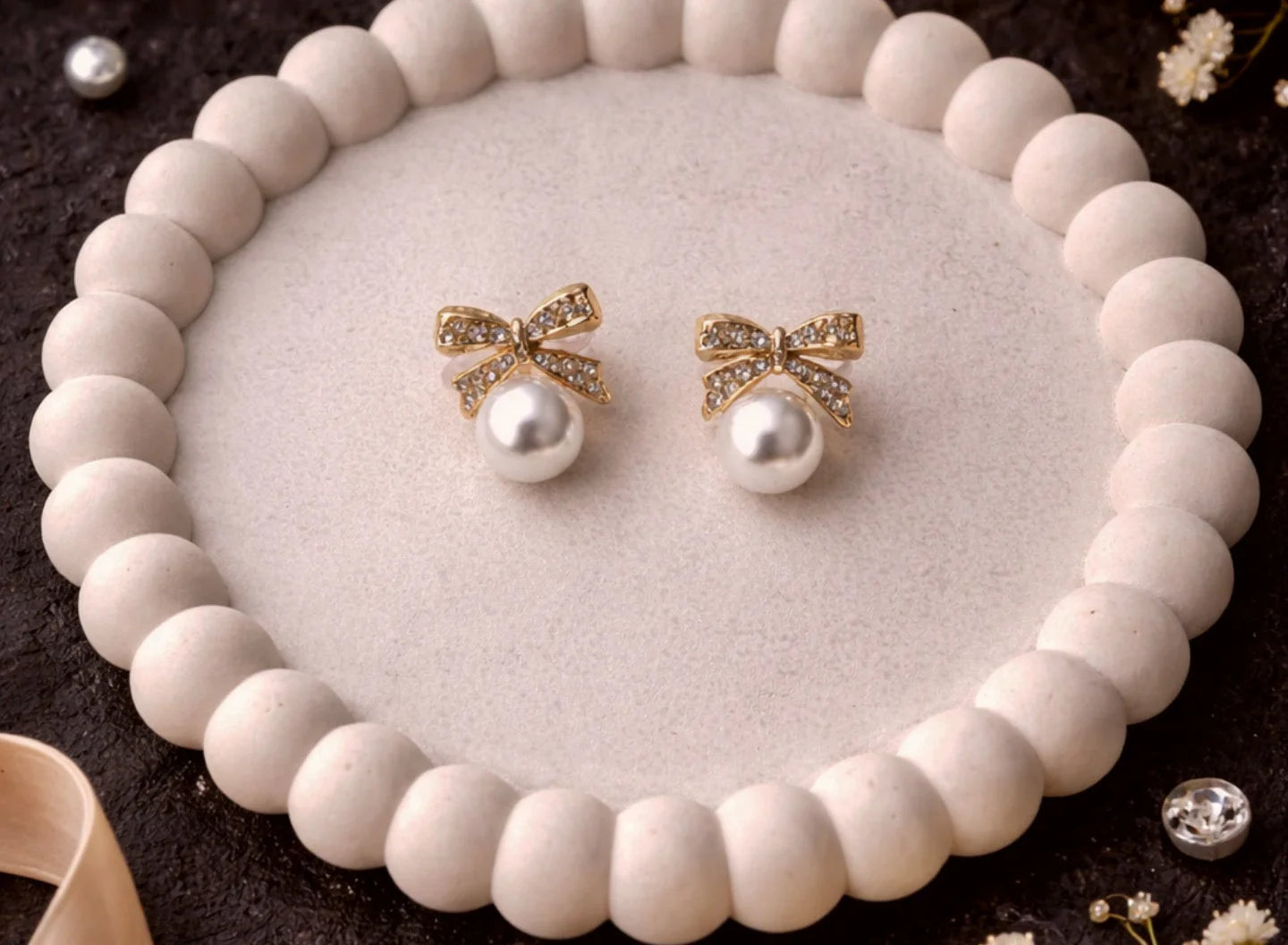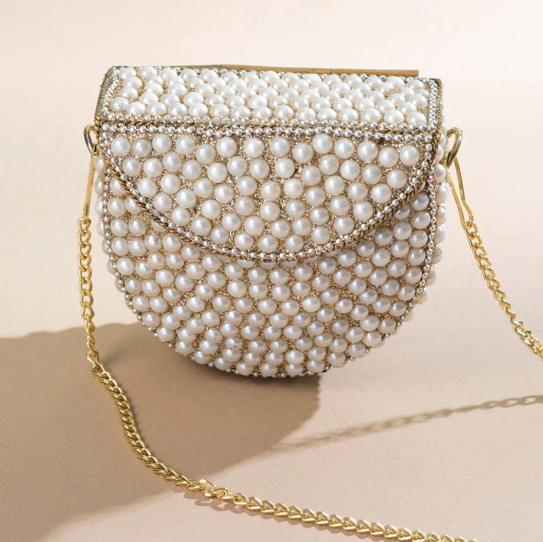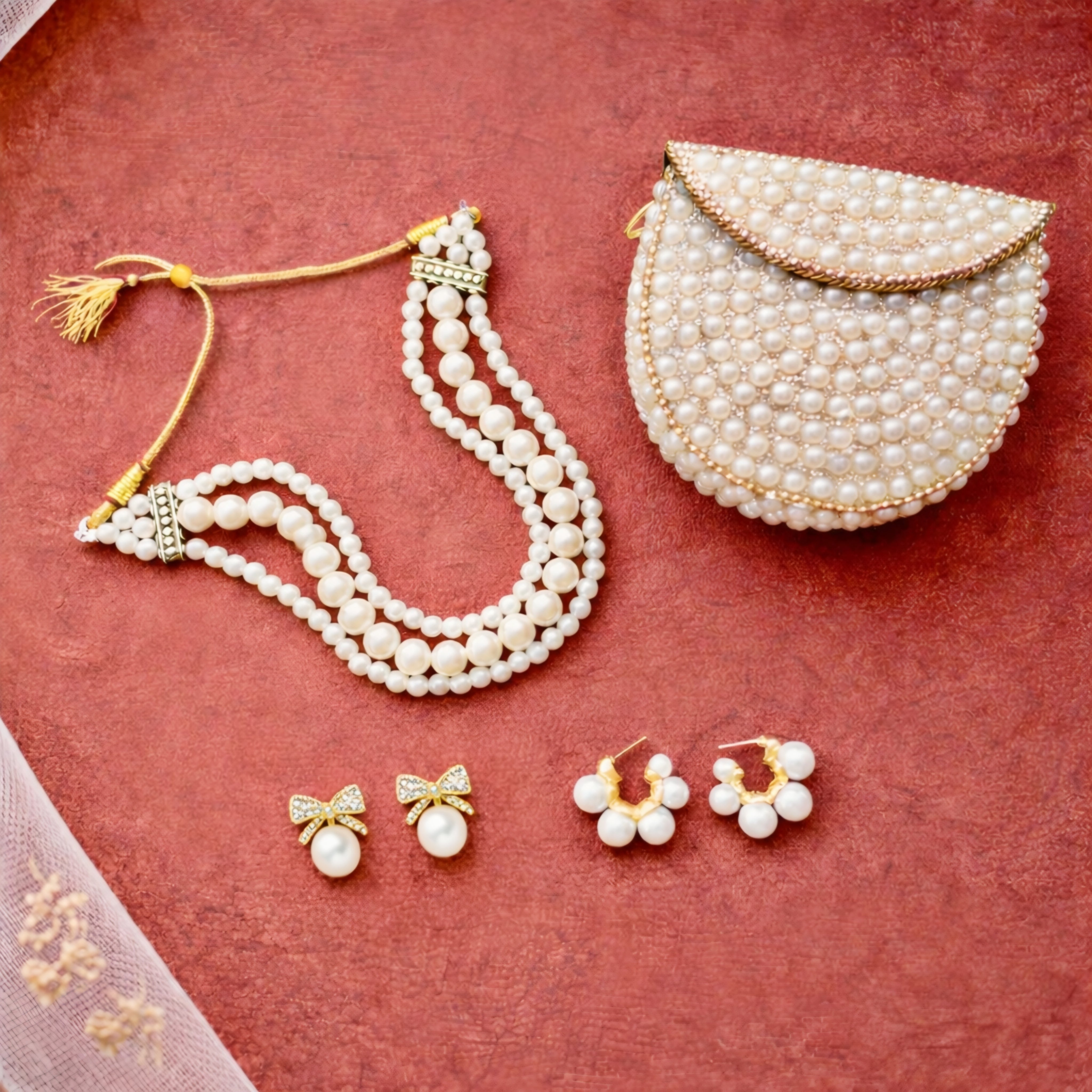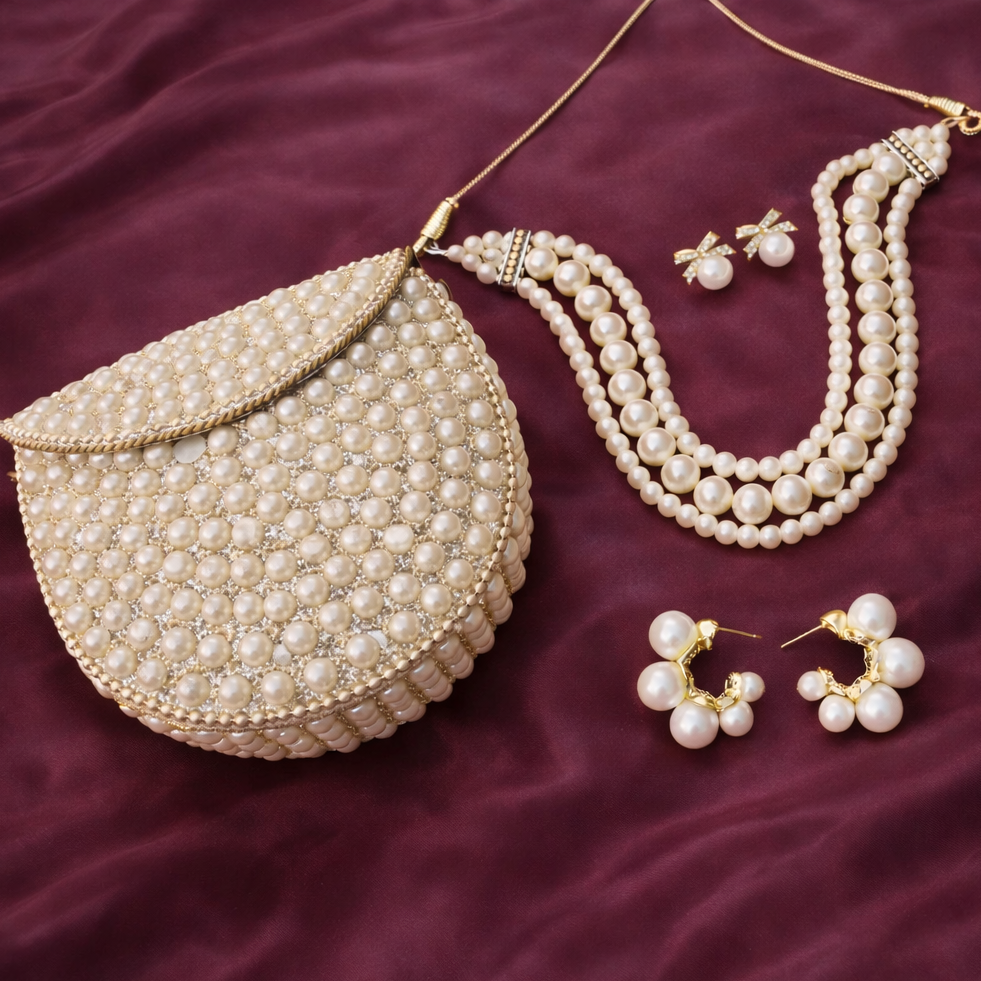 This combo contains 4 items: 1 Choker, 2 Earrings  & 1 Mini Pearl Bag